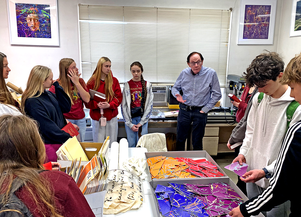 Mokiniams buvo pristatyti kai kurie lietuvių meno darbai. Tarp jų – antrojo aukšto koridoriuje eksponuojama ekspresionisto Prano Domšaičio (1880–1965) tapyba. Visiems buvo įdomu sužinoti, kad šio dailininko kūryba buvo eksponuojama visame pasaulyje, net ir Vatikano muziejuje. Ant kitos sienos – daugiau nei prieš 200 metų sukurti lietuvių autoriaus Adomo Vinkaus religinio turinio grafikos darbai, surasti Putnamo Marijonų gimnazijos bibliotekoje.