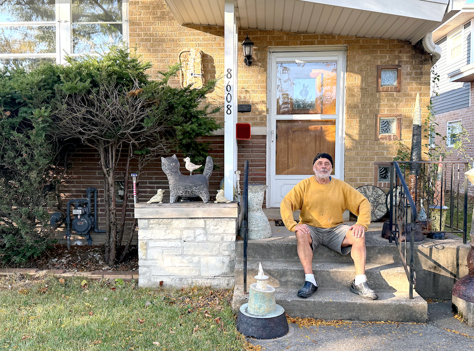 Va, katinas namo priekyje – visų traukos objektas. Jis buvo su vienu paukščiuku, tupinčiu jam ant nugaros. Gyvenime taip nebūna, kad tokie priešingi individai būtų tokie artimi. Nebūna, kad katinui ant nugaros paukščiukas tupėtų ir jam giesmę giedotų. Tai truputis absurdo. Bet nepaisant to, aš dabar dar du paukščiukus „patupdžiau“ katinui ant nugaros. Nėra tokio užbaigtumo, gali kisti viskas. Aš daug darbų, jei tai nebūtų keramika, patobulinčiau. O gal kartais betobulindamas pagadinčiau?