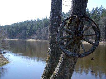 brandžiausius kūrinius. Medžių paunksmėje ant kelmo užkeltas girnų akmuo, — ant