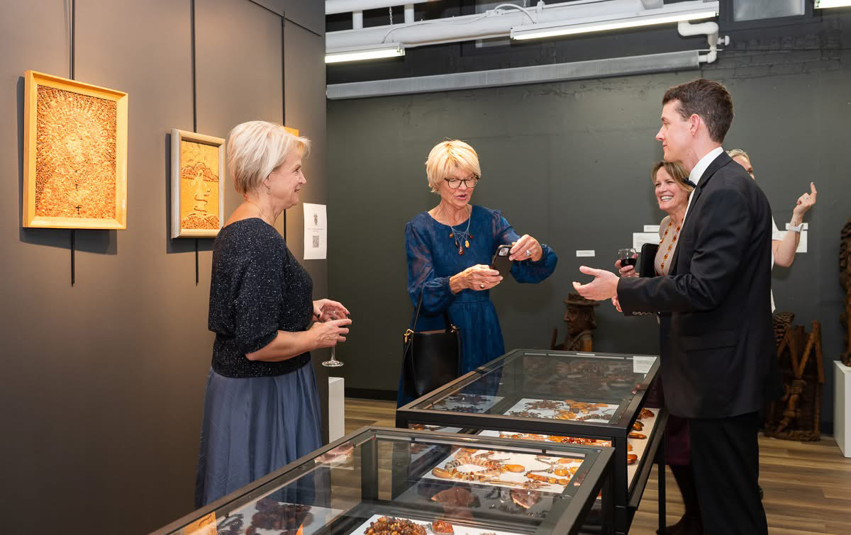 Sandėliuose suradome tokių kūrinių, kurie nebuvo eksponuoti: vitražai, medžio skulptūrų, taip pat atsirado nauja gintaro ekspozicija. Gintaras čia niekada nebuvo eksponuojamas. Šiai parodai Ramutė Kemežaitė-Kazlauskas paskolino keletą gintaro darbų, o visi kiti yra muziejaus. Kur radome gintaro darbų? Kai kurie iki šiol buvo laikomi stalčiuose, maišeliuose… Kai nusprendžiau, kad padarysime gintaro ekspoziciją, tuomet dar klausiau žmonių, ar kas nenorėtų paaukoti muziejui savo namuose turimų gintaro darbų. Buvo kas padovanojo, Kęstutis ir Regina Masalskiai net iš Lietuvos atsiuntė. Tikiuosi, kad gintaro ekspozicija per laiką dar pagausės ir taps dar įspūdingesnė.