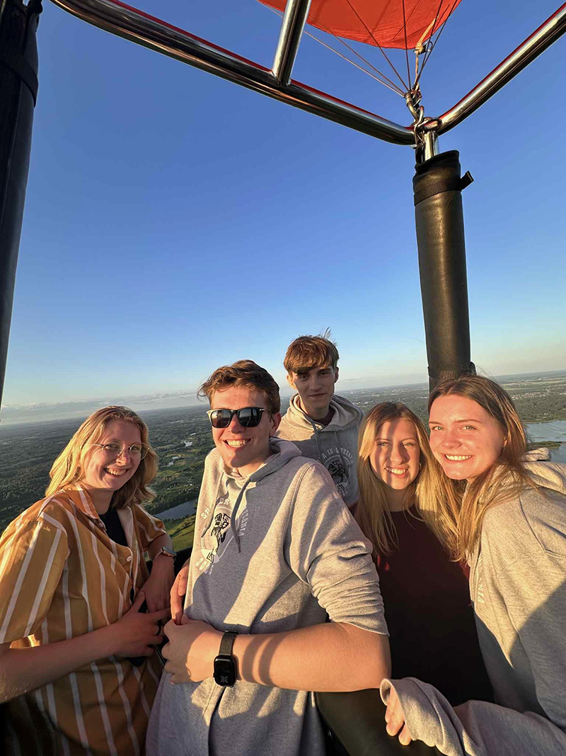 Už dar keleto dienų karšto oro balionais pakilome aukštai į padanges. Kelias savaites mokėmės ir gyvenome, susipažindami su Lietuva ir šalies kultūra, tačiau su niekuo nepalyginsi kraštovaizdžio grožiui, pamatytam iš aukštai. Pakilę balionu už Vilniaus, švelniai skridome virš nuostabių laukų ir ežerų. Iš dangaus rodėme vieni kitiems, ką matome – stirnas, šunis ir daugybę kitų gyvūnų, vingiuojančias upes, gausybe bažnyčių ir miškų. Kai kurie net pastebėjo, kad daugelyje lietuvių namų yra auginami šunys, nes jų lojimas aidėjo net iki dangaus.