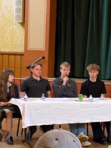 Pirmąją konferencijos dieną vyko vyriausių mokinių ir tėvų simpoziumas, pavadintas „Dirbtinis intelektas – naudingas ar kenksmingas?“, kurį moderavo mokytoja Nida Gedgaudaitė. Mokiniai debatuose pasiskirstė į dvi stovyklas, diskutavusias „už“ ir „prieš“ dirbtinio intelekto naudojimą ir poveikį tokiose srityse, kaip aplinkosauga, ekonomika, medicina, kritinis mąstymas ir kitos. Nuoširdžiai paruošę savo pristatymus, argumentus ir klausimus prieštaraujančioms pusėms, mokiniai savo diskusijose palietė ir švietimo klausimą. Vienas jų pralinksmino klausytojus, kai buvo išreikšta abejonė dėl mokytojo darbo patikimumo DI amžiuje. „Iš kur mokytojas ima medžiagą ir moko savo mokinius? Ar ta medžiaga tikra, pagrįsta, vertinga?!“ Visi suprantame, kad mokytojas DI amžiuje jau nėra vienintelis žinių šaltinis.