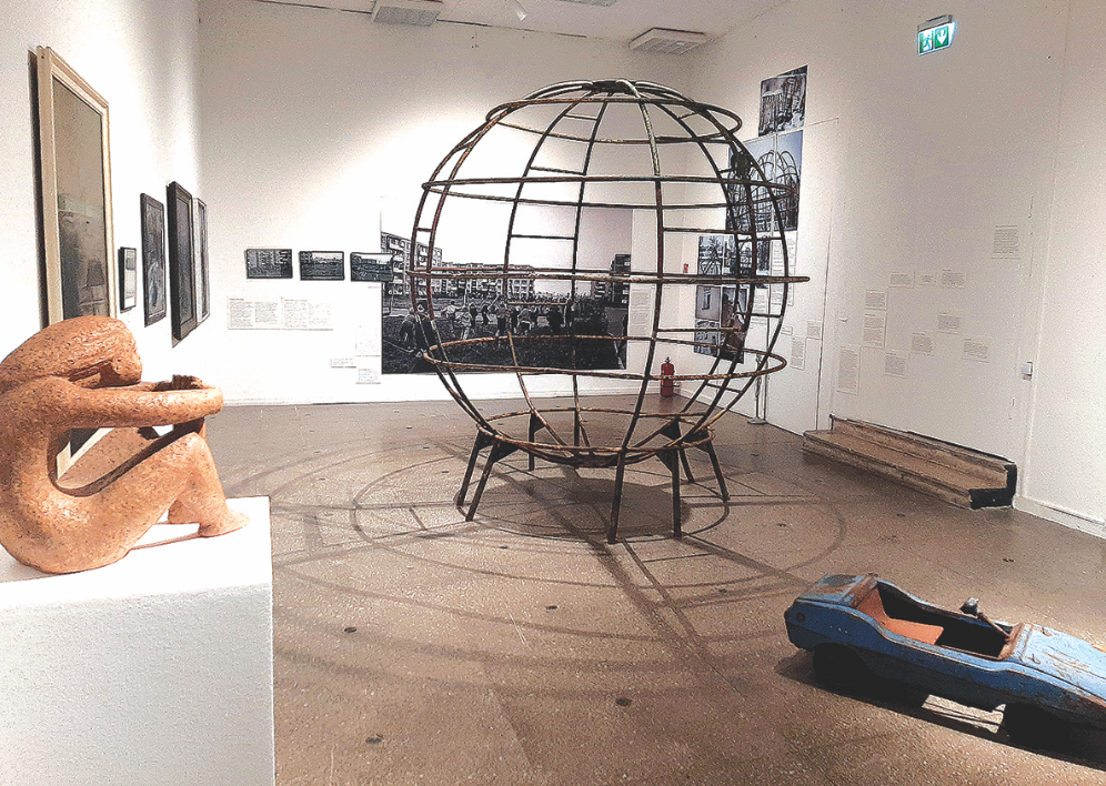 Tad pasukus į kairę gali pamatyti gražiuosius vitražus iš „Pasakos“ kavinės, o į dešinę – iš rekonstruojamo vaikų darželio Vilniuje atvežtus išmesti pasmerktus žaidimo aikštelės reliktus – dvi laipynes ir gaublį, kuris buvo sovietinių kolonijinių idėjų bei norų užkariauti žemę ir kosmosą įkūnijimas. Vėlyvuoju sovietmečiu dvilypumas, arba dvigalvystė, tapo visuotinai priimta, normalia būsena: sakyti ne tai, ką galvoji, atiduoti privalomąją duoklę sistemai, bet viduje išlikti savimi.