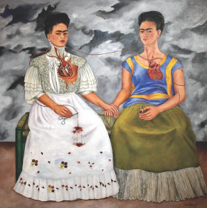 Rašant šį tekstą, man prieš akis tarsi pro rūką išnyra jos paveikslas „Dvi Fridos”. Jame pavaizduotos dvi moterys – dvynės, arba dvi Fridos, sėdinčios ant vieno suoliuko, o už jų nugarų plyti audringas, nerimo kupinas dangus. Tarsi tai vyktų šiandien. Jų širdys, pritvinkusios skausmo, sujungtos viena kraujo arterija. Tradiciškoji Frida, vilkinti mėgstamais Tehuanos rūbais, laiko už rankos moderniąją Fridą, apsigaubusią baltais nėriniais, ant kurių iš sužeistos širdies laša kraujas. Ji laiko save už rankos tarsi padrąsindama. Savo rankomis lyg tiltu bando sujungti skirtingas tapatybes, paveldėtas iš savo protėvių – europietiškąją ir meksikietišką. Vaizduodama savo skirtingas puses – kenčiančią, kraujuojančią ir stiprią, harmoningą, ji atskleidžia, koks daugialypis yra žmogus, vienu metu išgyvenantis daugybę įvairių emocijų. Tevirsta tai drąsos simboliu, padrąsinančiu mus mūsų kasdienybėse.