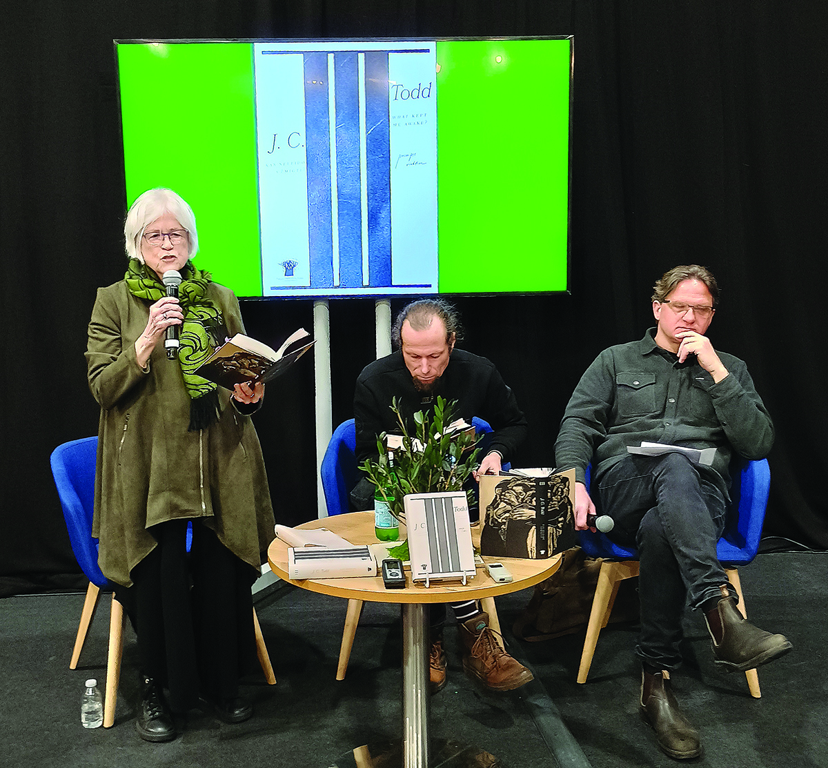 Iš JAV atvykusi poetė J. C. Todd dalyvavo savo dvikalbės eilėraščių knygos „Kas neleido užmigti/What kept Me Awake?“ pristatyme (kažkodėl pateikiami tik šie inicialai, ne pilnas vardas Jane). Svarbūs talkininkai renginyje buvo ne tik jį moderavęs poetas, vertėjas Rimas Užgiris (iš dalies taip pat „svečias“ – gimęs ir augęs JAV, šiuo metu besidarbuojantis Lietuvoje) bei Todd eilėraščius vertęs Marius Burokas, kartu su poete susėdę už stalelio, bet dar du Lietuvos rašytojai – Alvydas Šlepikas ir Kerry Shawn Keys (senokai tapęs vilniečiu).