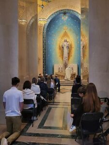 Pasibaigus pasivaikščiojimui po vienuolyną, keliavome į „Basilica of the National Shrine of the Immaculate Conception“. Šioje milžiniškoje bazilikoje yra lietuvių pastatyta Šiluvos Marijos koplyčia. Ji išpuošta liaudiškais motyvais, o mozaikų spalvos labai ryškios, gražios ir patrauklios akiai. Lietuviai piligrimai dalyvavo šv. Mišiose, kurias atnašavo kunigas Puodžiūnas.